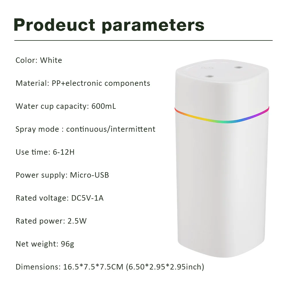 Air Humidifier Double Spray Port Essential Oil Aromatherapy Humidifier Mute Atomizer Colorful Lights For Home Office Car 600ML USB